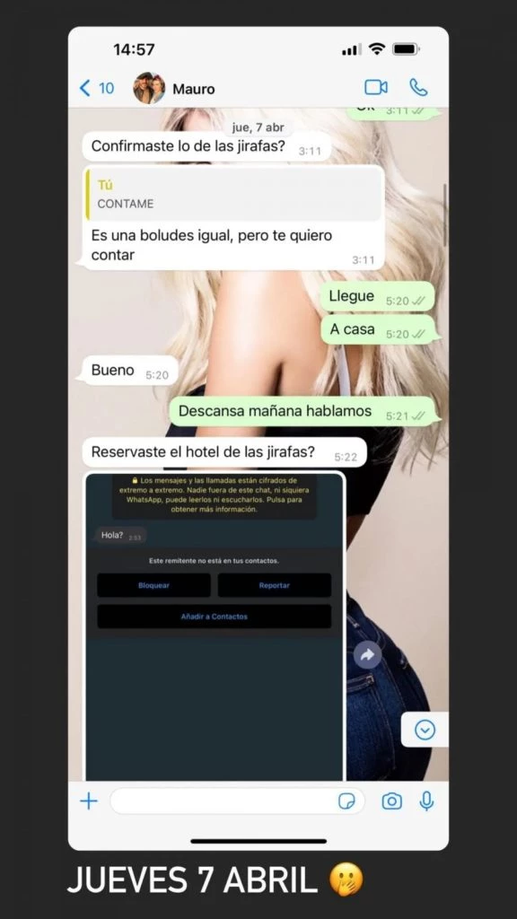 "Es una boludez igual, pero te quiero contar", le dijo Icardi, mientras ella llegaba a su casa. Y cuando estuvo tranquila y le dijo “CONTAME”, él le envió la captura del mensaje enviado desde el celular de Mancha La Torre, uno de los íntimos de la China.