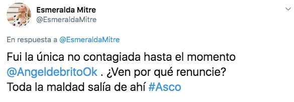La actriz, que también está en guerra con sus propios hermanos por la herencia que dejó su padre, fallecido este mismo año, encaró después a De Brito, co conductor del ciclo junto a Laurita Fernández pero la cara mediática del programa. "Fui la única no contagiada hasta el momento, Angel de Brito. ¿Ven por qué renuncié? Toda la maldad salía de ahí. Asco" escribió.