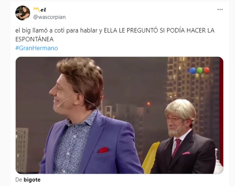 "Lo lindo que va a ser una pelea entre Coti y furia, mamita querida", "Cuando Coty haga la compra semanal y compre todo el presupuesto en queso rallado", "La que no está muy contenta con la llegada de Coty es Furia jajajaja. revivió Gran hermano bebessss", "Revivió GH gente. Entró la one, la única e inigualable Coti Romero", "El Big llamó a Coti para hablar y ella le preguntó si podía hacer la espontánea jajaja".