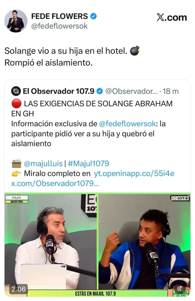 Como si esto fuera poco, afuera de la casa también se sumaron voces que alimentaron la polémica. El periodista Fede Flowers compartió información en redes que generó aún más revuelo entre los fanáticos del reality, vinculando tensiones internas y movimientos estratégicos que no siempre se ven al aire.