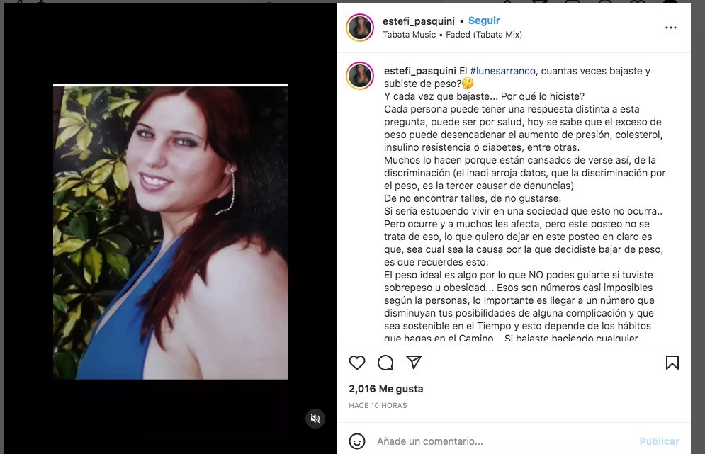 “¿Cuántas veces bajaste y subiste de peso? Y cada vez que bajaste, ¿por qué lo hiciste?”, arrancó en su posteo la pareja de Cormillo. Después se zambulló a aportar un análisis del tema: “Cada persona puede tener una respuesta distinta a esta pregunta, puede ser por salud, hoy se sabe que el exceso de peso puede desencadenar el aumento de presión, colesterol, insulino resistencia o diabetes, entre otras”.