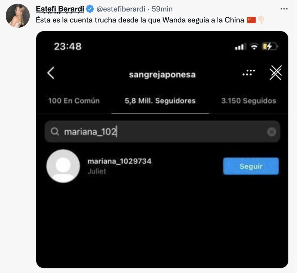 Estefi Berardi realizó un rastreo de pruebas y capturó diversas pantallas que permitían visualizar que Nara intentó utilizar otra cuenta, un perfil falso con el que suele comentar de manera negativa contra la China. Incluso accedió hasta un proceso en que se verifica que los datos de recuperación coinciden con el mail y el celular de la esposa de Icardi.
