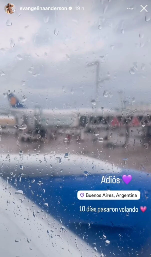 “Adiós. 10 días pasaron volando”, escribió Anderson entre sus historias y sobre un breve video que filmó desde adentro del avión en Ezeiza y con la lluvia del miércoles 5 de febrero cayendo sobre el vidrio de la ventana . Luego, en otro posteo mostró cómo viajaba en primera, cubierta con una manta y mirando una película en la pantalla individual. ¡Hasta pronto!