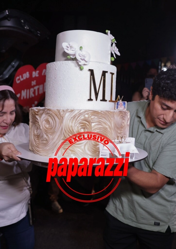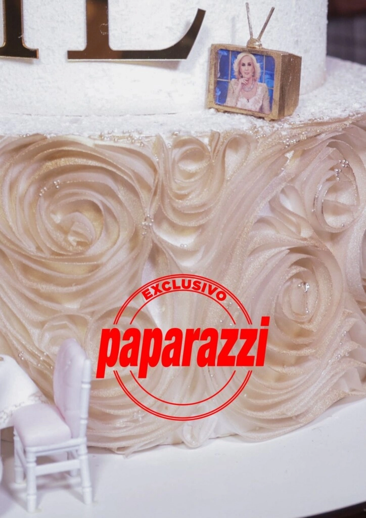 Uno de los momentos más comentados fue la impresionante torta de dos pisos, decorada con flores y las iniciales doradas de la conductora. Con un diseño clásico y elementos que recordaban sus icónicas mesas de almuerzo y un mini televisor, la torta se convirtió en la estrella de la mesa dulce, donde predominaban los tonos suaves y delicados.