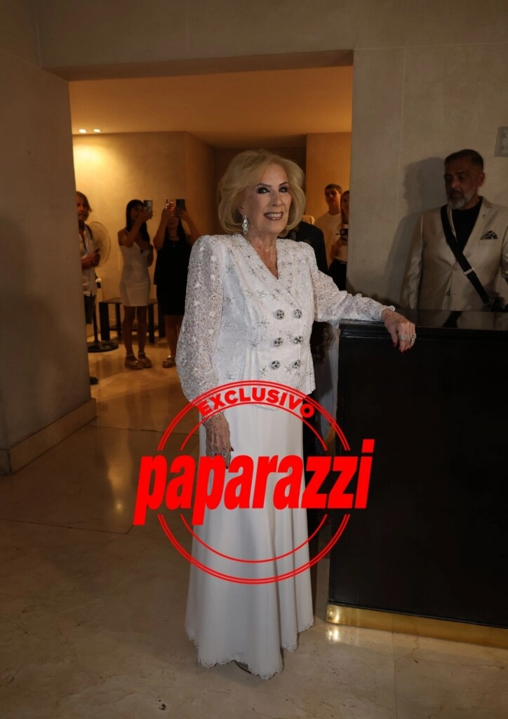 Para la ocasión, Mirtha lució un conjunto de alta costura en blanco y marfil diseñado por Claudio Cosano, con un saco bordado con delicados detalles brillantes y un vestido largo que resaltaba su porte elegante, complementado con aros colgantes que atraparon todas las miradas.