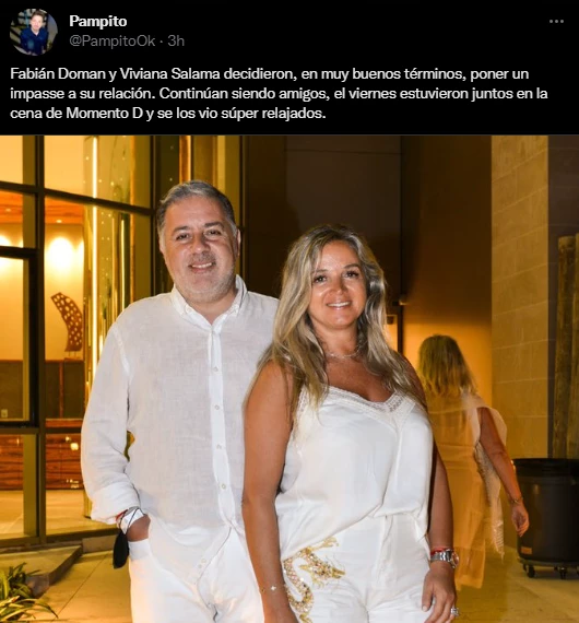 Con una foto del animador y la corredora de bienes raíces, en la que lucían radiantes y felices por disfutrar del amor, el panelista contó: “Fabián Doman y Viviana Salama decidieron, en muy buenos términos, poner un impasse a la relación”.