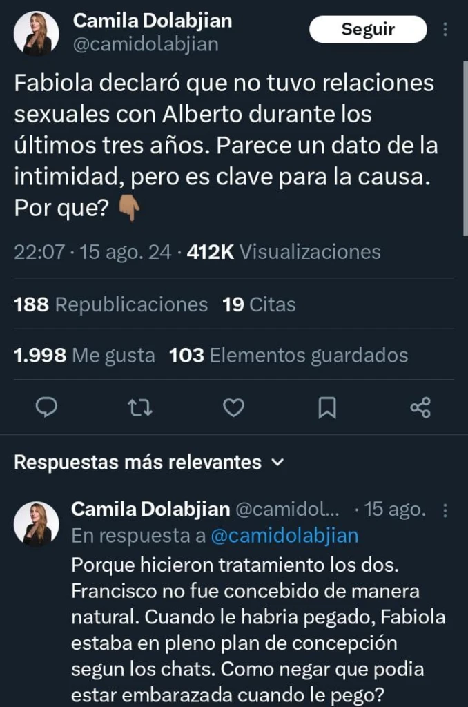 Camila Dolabjian, periodista en La Nación, expuso cuál es el trasfondo de esta revelación: “Fabiola declaró que no tuvo relaciones sexuales con Alberto durante los últimos tres años. Parece un dato de la intimidad, pero es clave para la causa”.