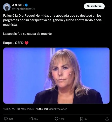 Ángel de Brito se encargó de dar la primicia a través de su cuenta en X a través de un mensaje contundente: “Falleció la Dra. Raquel Hermida, una abogada que se destacó en los programas por su perspectiva de género y luchó contra la violencia machista”. Y agregó un dato clave sobre su salud: “La sepsis fue su causa de muerte”.