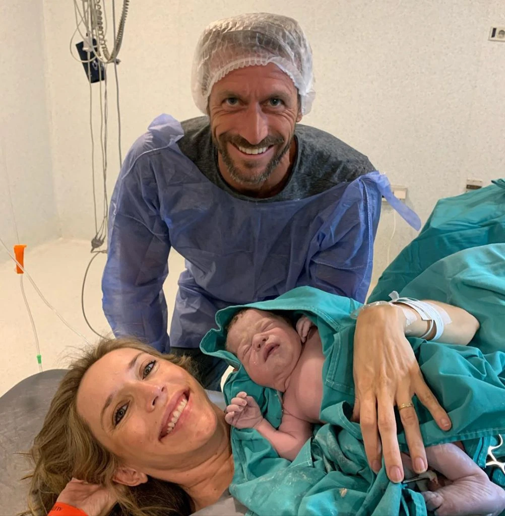 Desde la sala de partos, con la bata y la gorra especiales de quirófano, el ex nadador compartió una foto en donde se lo ve a él acompañando a su esposa, Valeria Lebeau, quien sostiene en brazos a Lautaro, el bebé recién nacido.