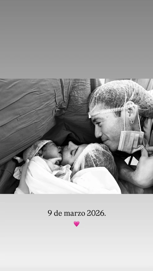 La primera en dar la noticia fue Martina, que publicó una imagen muy especial desde la sala de partos. En la foto, en blanco y negro, se la puede ver acostada en la camilla con Justina en brazos, con Londra inclinado sobre ambas. Los tres llevan puestos los gorros y barbijos del equipo médico, como parte de una imagen conmovedora.