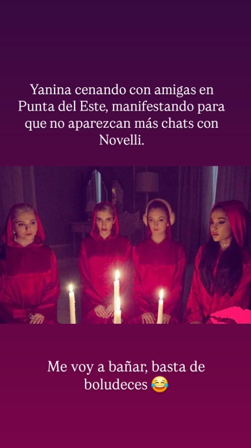 “Lo mismo dijeron de la Ruta del dinero K y terminaron todos presos, ejem”, comentó Iglesias y cerró con un posteo letal, una foto de cuatro jóvenes brujas a la que agregó: “Yanina cenando con amigas en Punta del Este, manifestando para que no aparezcan más mails con Novelli. Me voy a bañar, basta de boludeces”.