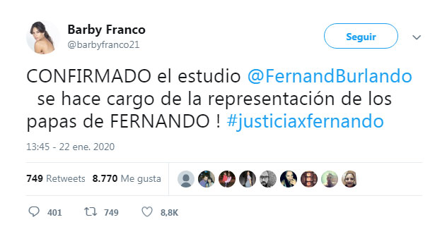 La encargada de dar la noticia fue su pareja, Barby Franco, quien a través de Twitter anunció: "Confirmado el estudio @FernandBurlando se hace cargo de la representación de los papas de FERNANDO!".