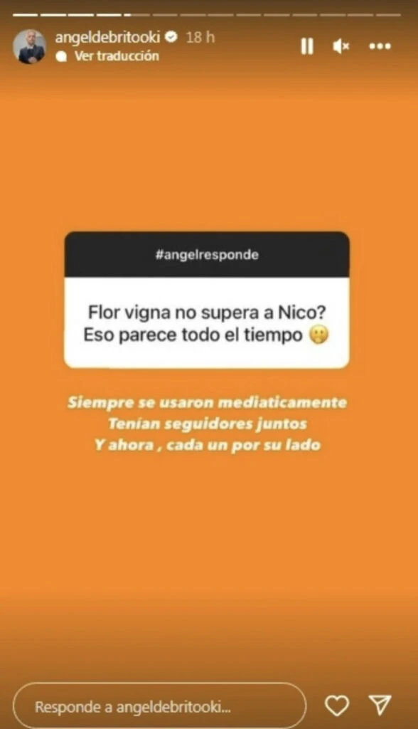 Ante esto, el rey del espectáculo, Ángel de Brito fue consultado sobre todo lo que sucede en el mundo Vigna-Ochiato-Peña y respondió tajante. "¿Flor Vigna no supera a Nico? Eso parece todo el tiempo", le consultó uno de sus seguidores.