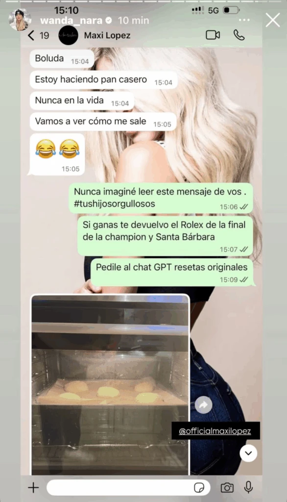 En los chats, Maxi López se mostró ansioso por su participación en MasterChef Celebrity: “Bolu..., estoy haciendo pan casero, nunca en la vida. Vamos a ver cómo me sale”. El exjugador de fútbol le envió una foto a la empresaria de lo que estaba cocinando.