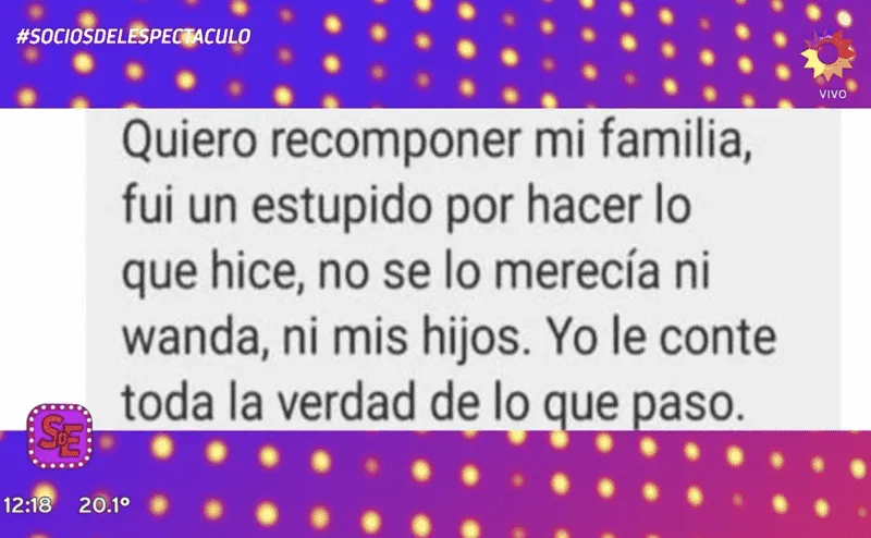 Y queda claro su intencionalidad de finalizar para siempre el lazo con Suárez: “Quiero recomponer mi familia, fui un estúpido por hacer lo que hice, no se lo merecía ni Wanda ni el resto de mi familia. Yo le conté todo lo que pasó".