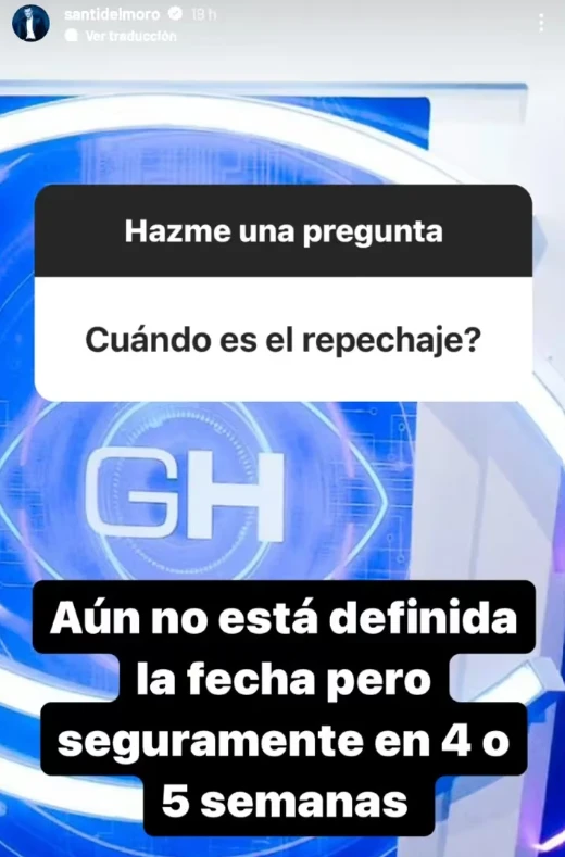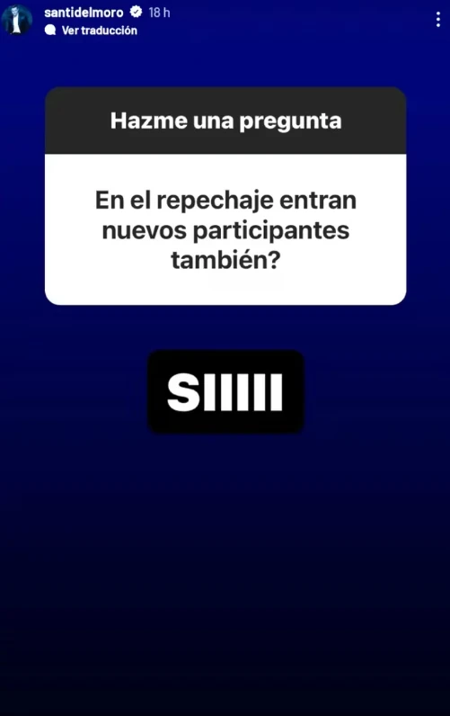 Del Moro reveló el dato a través de sus historias de Instagram, mientras respondía consultas de sus seguidores. “¿Cuándo es el repechaje?”, quiso saber una persona, a lo que el conductor develó: “Aún no está definida la fecha pero seguramente en 4 o 5 semanas”.