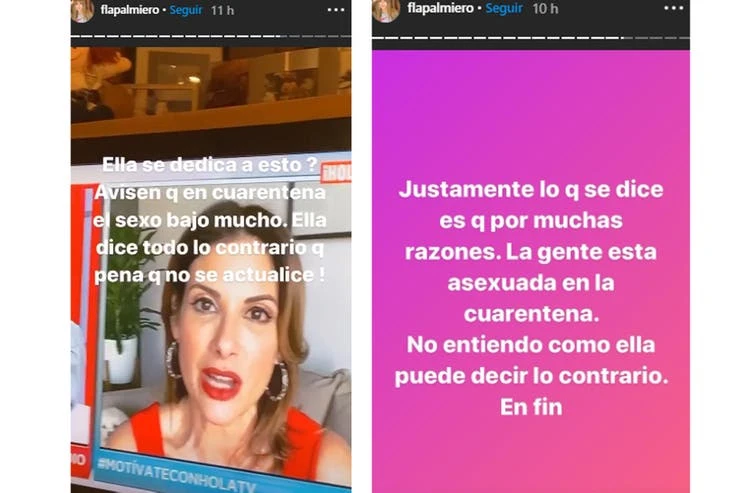 Resulta que Flavia no estaba de acuerdo con una entrevista en la que Alessandra se refería al sexo en la cuarentena. Entonces, Palmiero escribió en su historia: "¿Ella se dedica a esto? Avisenle que en cuarentena el sexo bajó mucho. Ella dice todo lo contrario. ¡Qué pena que no se actualice!".