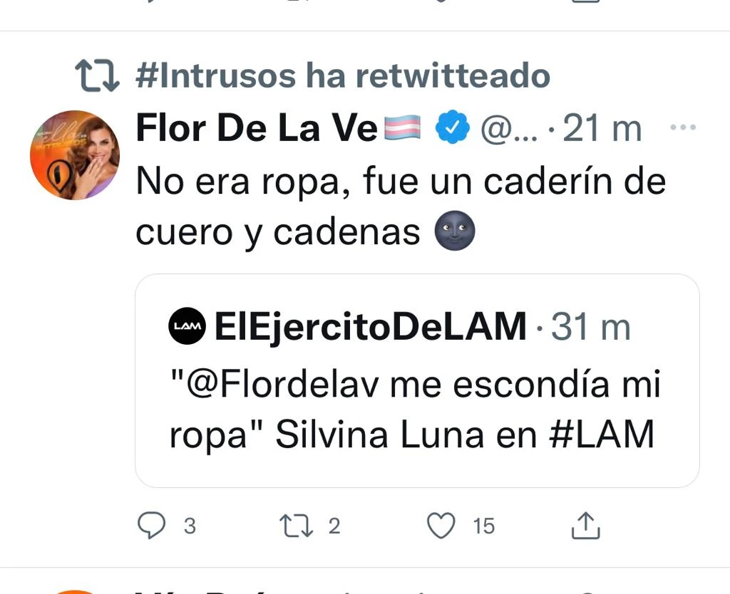 Y Flor, desde su cuenta oficial de Twitter, replicó un mensaje de la cuenta del programa y le contestó a Luna, reconociendo lo que había hecho. Pero marcando una diferencia de "concepto". "No fue ropa, fue un caderín de cuero y cadenas", expresó De La Ve.