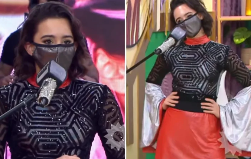 La ganadora del Bailando 2019 agradeció a la diseñadora Leonela Santana al lucir el outfit formado por un vestido ajustado pero cómodo con mangas murciélago, con unas medias estilo bucaneras y un barbijo a tono.