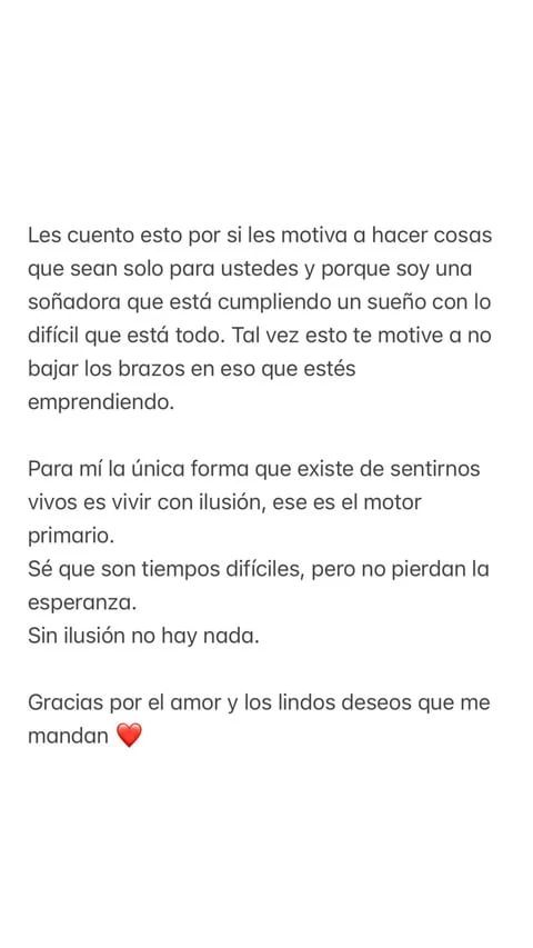 "Para mí, la única forma de sentirnos vivos es vivir con una ilusión, ese es el motor primario. Sé que son tiempos difíciles pero no pierdan las esperanzas. Sin ilusiones, no hay nada", propuso Jazmín Peña a sus miles de seguidores en Instagram, donde también compartió una imagen de cómo va quedando su nueva casa.