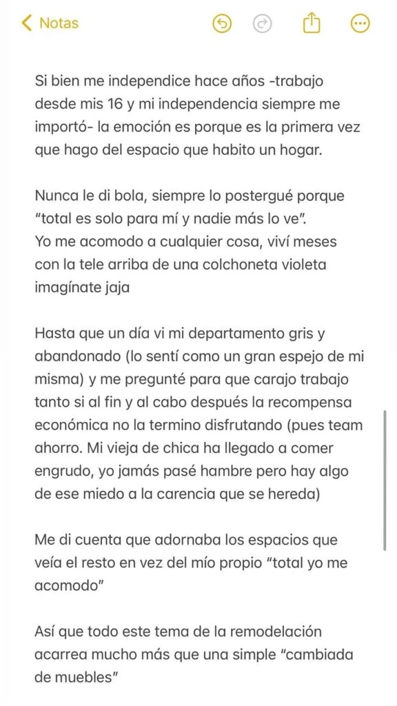 "Nunca le di bola, siempre lo postergué porque pensaba que `total es para mí y nadie lo ve`. Yo me acomodo a cualquier cosa. Viví meses con la tele arriba de una colchoneta violeta, imagínate jaja", recordó la bailarina. "Hasta que un día vi mi departamento gris y abandonado...".