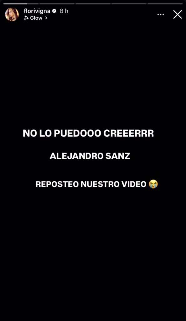 “Primero pasó esto”, lanzó Flor en tanto ponía en pantalla el mensaje de un usuario de instagram que le comentó: “Pobre Alejandro Sanz. Si te escucha se muere”. “Pero después pasó que el Ale no solamente nos escuchó sino que nos bancó y de repente todos los comentarios cambiaron”, continuó la ex de Luciano Castro.
