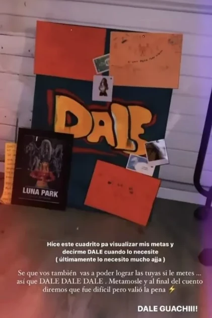 Además de la foto, dejó un mensaje: “Hice este cuadrito para visualizar mis metas y decirme DALE cuando lo necesite (últimamente lo necesito mucho). Sé que vos también vas a poder lograr las tuyas si le metés, así que DALE DALE DALE. Metamosle y al final del cuento, diremos que fue difícil pero que valió la pena. DALE GUACHÍN”.