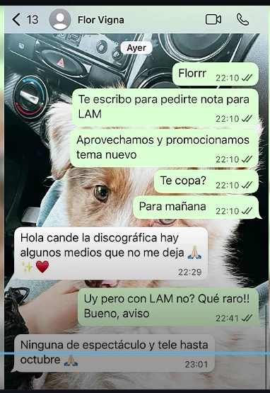 En ese diálogo con la producción se lee la propuesta: “Hola Flor, te escribo para pedirte una nota para LAM. Aprovechamos y promocionamos tu disco nuevo, ¿te copa para mañana?”. De ese modo, Vigna esgrimió una fundamentación extraña: “Hola Cande, la discográfica hay algunos medios que no me deja”.