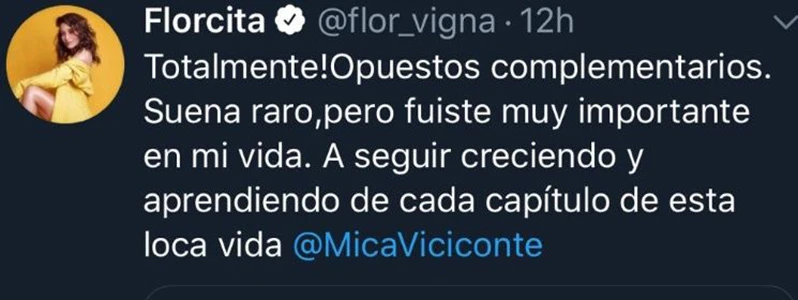 Semejante declaración mereció respuesta y Flor respondió. Primero retuiteó el mensaje que Mica escribió en la red social del pajarito y contestó: “¡Totalmente! Opuestos complementarios. Suena raro, pero fuiste muy importante en mi vida. A seguir creciendo y aprendiendo de cada capítulo de esta loca vida @Mica Viciconte”.
