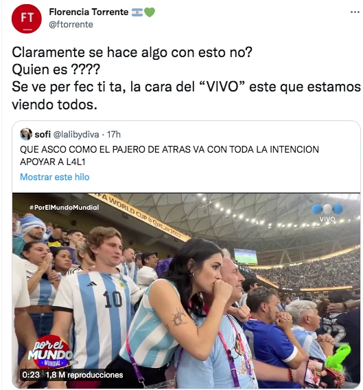 En medio de los festejos por la consagración de Argentina como campeón mundial de fútbol, una denuncia de Florencia Torrente movió el avispero y sacudió a la farándula. Según la actriz,un video de Lali Espósito celebrando junto a Marley el último penal y la obtención de la Copa en el estadio Lusail le permitió advertir que un simpatizante argentino que estaba detrás suyo intentó "apoyarla" en plena tribuna.