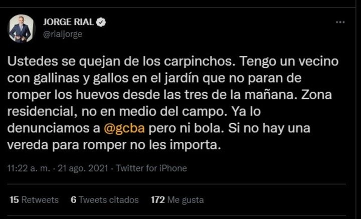 En todo ese contexto, Jorge aprovechó para recrudecer un problema que ya había contado en febrero, que refiere a la extraña tenencia de gallos, gallinas y ovejas. Ahora, en las últimas horas publicó en Twitter: "Ustedes se quejan de los carpinchos. Tengo un vecino con gallinas y gallos en el jardín que no paran de romper los huevos desde las tres de la mañana".