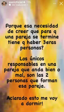 En un segundo post, Axel cuestionó la necesidad de asociar la ruptura de una pareja con la presencia de terceras personas, y afirmó que la responsabilidad recae exclusivamente en las dos personas que conforman la relación. Concluyó su declaración con un mensaje tranquilizador, expresando su alivio al compartir su verdad.