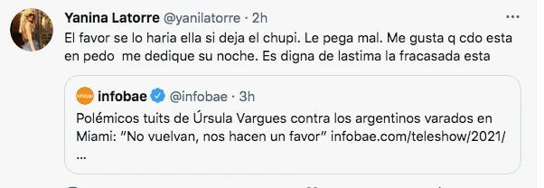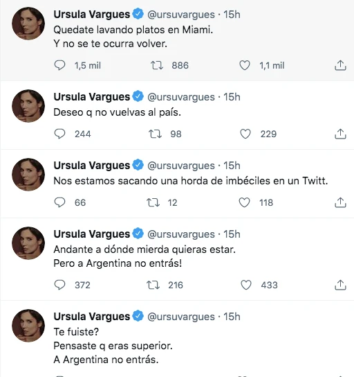 Siempre filosa, Ursula Vargues utilizó su cuenta de Twitter para festejar que haya argentinos que no pueden volver al país. "¿Te fuiste? ¿Pensaste que eras superior? A Argentina no entrás", escribió. No fue eso solo. "Andate a donde mierda quieras estar, pero a Argentina no volvés", "Deseo que no vuelvas al país" y "Quedate lavando platos en Miami, y ni se te ocurra volver" fueron el resto de los tuits que, lógicamente, generaron reacción a un lado y al otro de los dos bandos en los que se divide la porción mayoritaria de la sociedad.