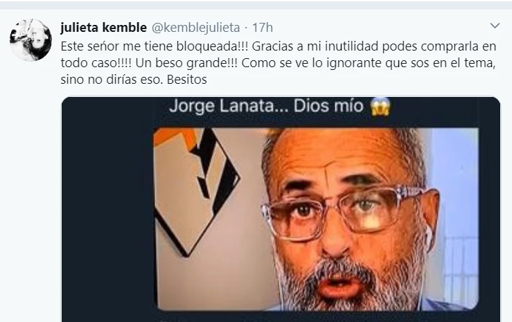 "¡Este señor me tiene bloqueada!¡Gracias a inutilidad podés comprarla en todo caso! ¡Un beso grande! Como se ve lo ignorante que sos en el tema, sino no dirías eso", se despachó la rubia.