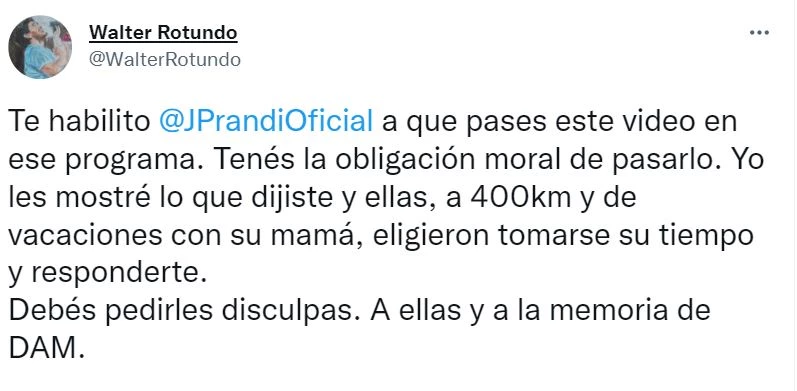 Finalmente, el fan le dijo a Juli: “Te habilito @JPrandiOficial a que pases este video en ese programa. Tenés la obligación moral de pasarlo. Yo les mostré lo que dijiste y ellas, a 400 km y de vacaciones con su mamá, eligieron tomarse su tiempo y responderte”.