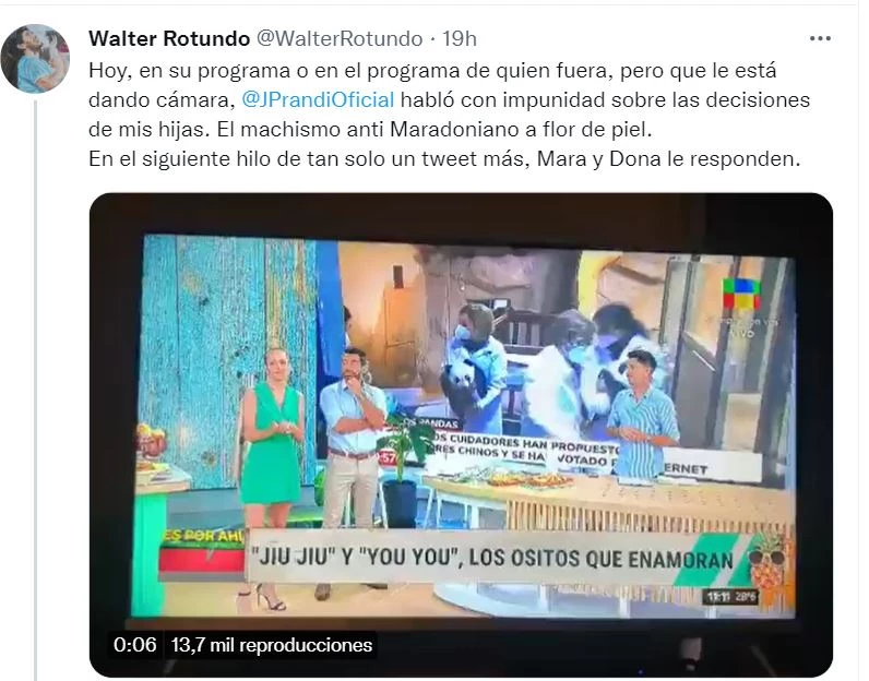 “Hoy, en su programa o en el programa de quien fuera, pero que le está dando cámara, Julieta Prandi habló con impunidad sobre las decisiones de mis hijas. El machismo anti Maradoniano a flor de piel. En el siguiente hilo de tan solo un tweet más, Mara y Dona le responden”, escribió.