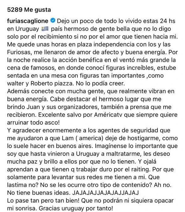 "Imagínense lo importante que soy que hasta vinieron a Uruguay a maltratarme, les deseo mucha paz y brillo a ellos por que no lo tienen. Y ojalá aprendan a que tienen q trabajar duro por el rating. Por que solamente para levantar sus redes me tienen a mi. Que lastima no? No se les ocurre otro tipo de contenido? Ah no. No tiene buenas ideas. JAJAJAJJAJAJAJJAJAJ Lo pase tan pero tan bien! Que no podrán ni siquiera opacar mi sonrisa. Gracias uruguay por tanto!", cerró.