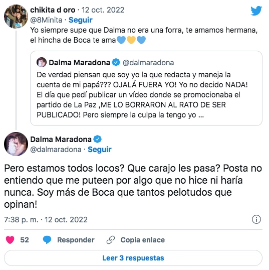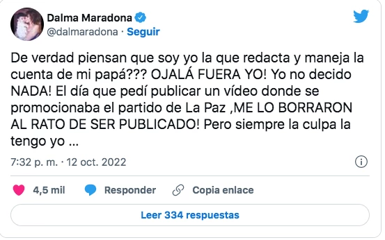 "¿De verdad piensan que soy yo la que redacta y maneja la cuenta de mi papá? ¡OJALÁ FUERA YO! ¡Yo no decido NADA! El día que pedí publicar un vídeo donde se promocionaba el partido de La Paz, ¡ME LO BORRARON AL RATO DE SER PUBLICADO! Pero siempre la culpa la tengo yo…", expresó Dalma, súper enojada, con palabras en mayúscula, para resaltar entre las letras su bronca.