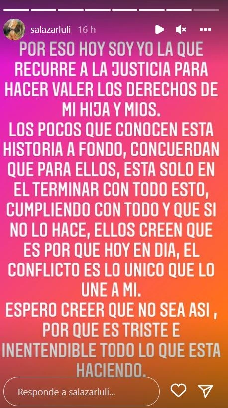 Así Salazar cerró su descargo: “Por eso hoy soy yo la que recurre a la Justicia para hacer valer los derechos de mi hija y míos. Los pocos que conocen esta historia a fondo, concuerdan que para ellos está sólo en él terminar con todo esto, cumpliendo con todo”.