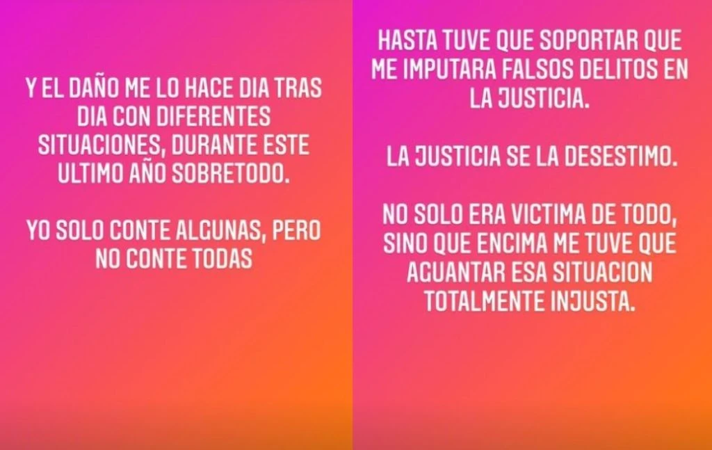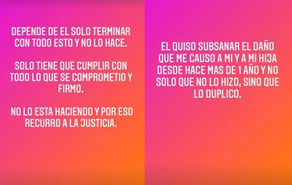 “Depende de él sólo terminar con todo esto y no lo hace, sólo tiene que cumplir con todo lo que se comprometió y firmó", avanzó, y agregó: "No cumple y por eso recurro a la Justicia. Hasta tuve que soportar que me imputara falsos delitos… No sólo era víctima de todo sino que encima tuve que aguantar esa situación totalmente injusta".