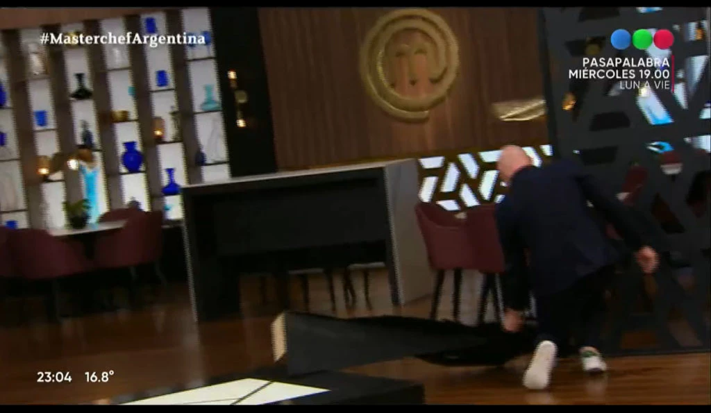 Luego llegó el turno de Germán Martitegui quien ocupó el lugar de del Moro. “Participantes, quedan sólo cinco minutos”, dijo el jurado sujetando el cartel de Santiago del Moro. “Apúrense porque esto termina”, señaló serio. Sin embargo, un movimiento en falso le jugó una mala pasada y todo terminó en blooper.