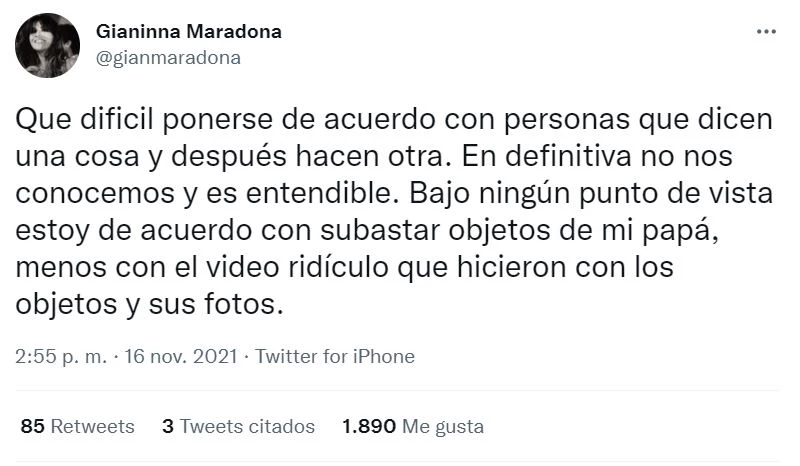 Pero hay alguien que no quiere saber nada con deshacerse de las cosas de su papá: Gianinna Maradona. Y así lo hizo saber con un furioso desahogo en Twitter, donde apuntó muy crítica contra la decisión que tomaron sus hermanos.