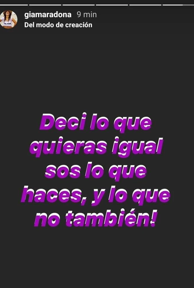 En ese sentido, la primera en expresarse al respecto fue Gianinna, quien eligió su Instagram para compartir su pensamiento. La expareja del Kun Agüero escribió una storie: “Decí lo que quieras igual, sos lo que hacés y lo que no también”.