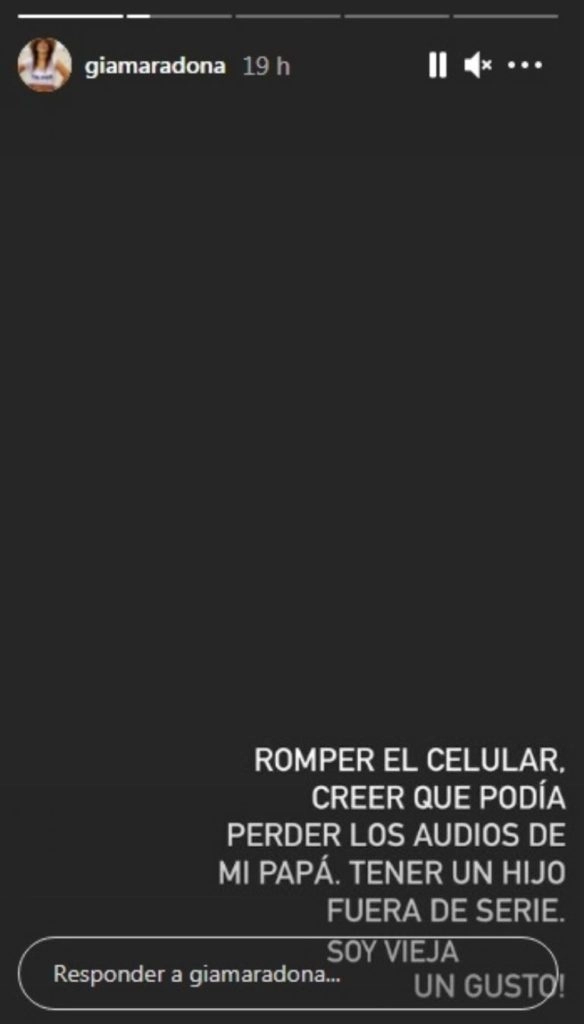 La joven Maradona escribió: "Romper el celular. Creer que podía perder los audios de mi papá. Tener un hijo fuera de serie. Soy vieja". Así, Gianinna retrató el transcurso de un estadío de preocupación a la tranquilidad de recuperar todo lo que guarda con amor en su dispositivo.