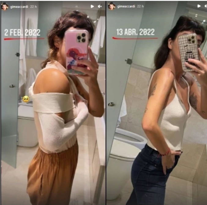 "Tengo una foto que le mandé a mi amiga el día del accidente y una que le mandé el otro día. No la iba a mostrar porque soy bajo perfil y no me gustan estas cosas pero decidí hacerlo... estoy a 9 semanas de la cirugía y quedé así", contó en su perfil digital para acompañar las imágenes.