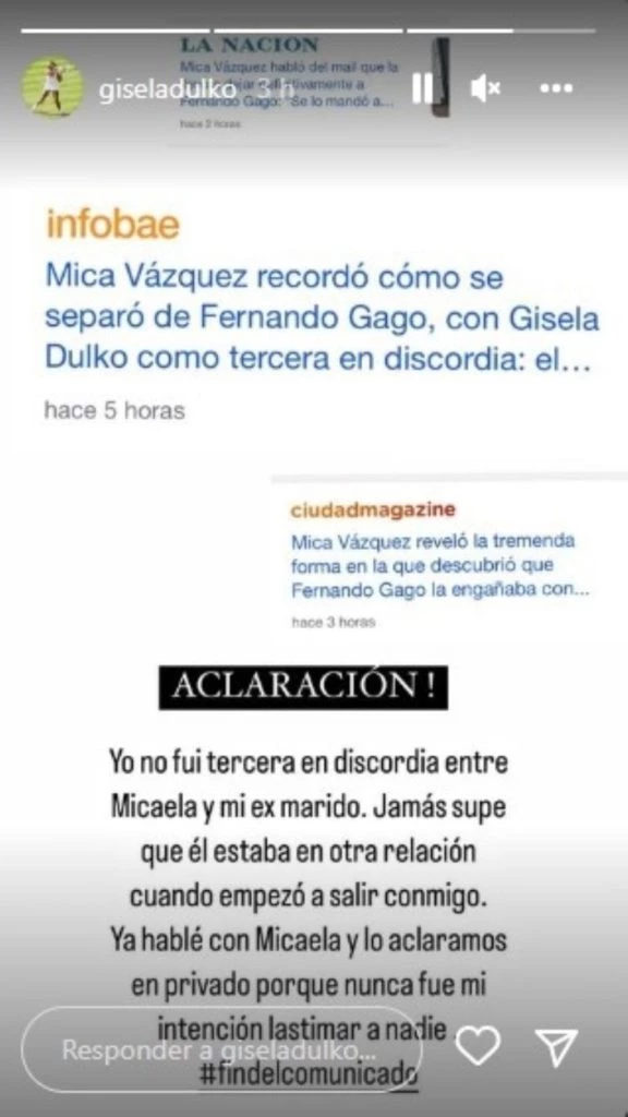 Tras esta situación, la extenista se descargó a través de sus Stories: "Yo no fui la tercera en discordia entre Micaela y mi exmarido. Jamás supe que él estaba en otra relación cuando empezó a salir conmigo. Yo hablé con Micaela y lo aclaramos en privado porque nunca fue mi intención lastimar a nadie. Fin del comunicado", escribió.