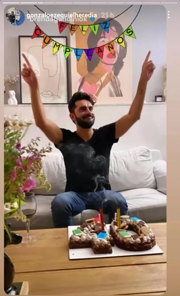 Brenda Gandini mientras tanto compartió fotos de su pareja feliz soplando las velitas en la torta con número 40 que le regaló. Una postal romántica abrazado a su novia y sus amigos riendo junto a él fueron suficiente para hacer feliz a Heredia.