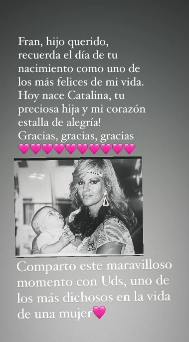 "Fran, hijo querido, recuerdo el día de tu nacimiento como uno de los más felices de mi vida. ¡Hoy nace Catalina, tu preciosa hija y mi corazón estalla de alegría! Gracias, gracias, gracias", escribió Graciela en sus redes, con corazones rosados para la ocasión.