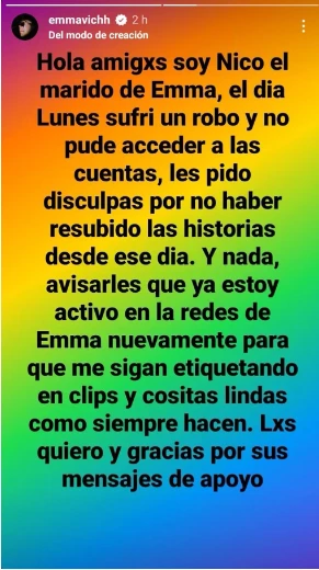 Por su lado, el propio Nicolás contó lo que vivió a través de la cuenta de Instagram de Emmanuel, aseguró que ya se encuentra activo nuevamente en las redes y agradeció a sus seguidores por los mensajes de apoyo. “El día lunes sufrí un robo y no pude acceder a las cuentas. Avisarles que ya estoy activo en las redes de Emma nuevamente. Los quiero y gracias por sus mensajes de apoyo”, comentó el cordobés.