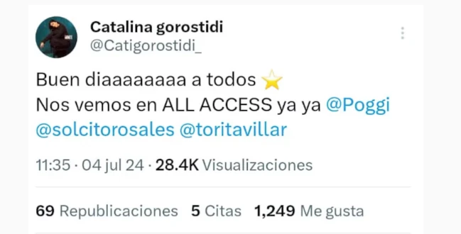 En primera instancia, Gorostidi anunció el cese del conflicto proque sailó a Twitter a anunciar con bombos y platillos: “Buen día a todos. Nos vemos en All Access, ya, ya, con Poggi, Sol Rivas y La Tora”. Así regresó a trabajar en el streaming y se pronostica que estará en la gran gala del lunes con todos los participantes en el último programa.